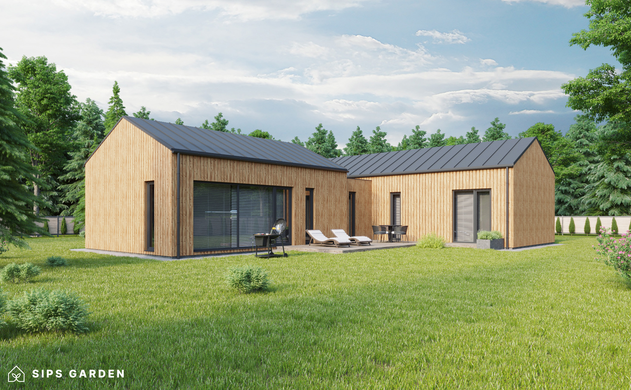 Questo prodotto è realizzato con un sistema SIP (Structural Insulated Panels) avanzato, di alta qualità e ad alta efficienza energetica, che garantisce un isolamento superiore e una lunga durata. L’esterno è caratterizzato da finestre e porte a doppio vetro in PVC grigio antracite, completate da una copertura del tetto in EPDM, da una robusta grondaia in acciaio e eleganti dettagli di finitura in acciaio, tutti inclusi come elementi standard.